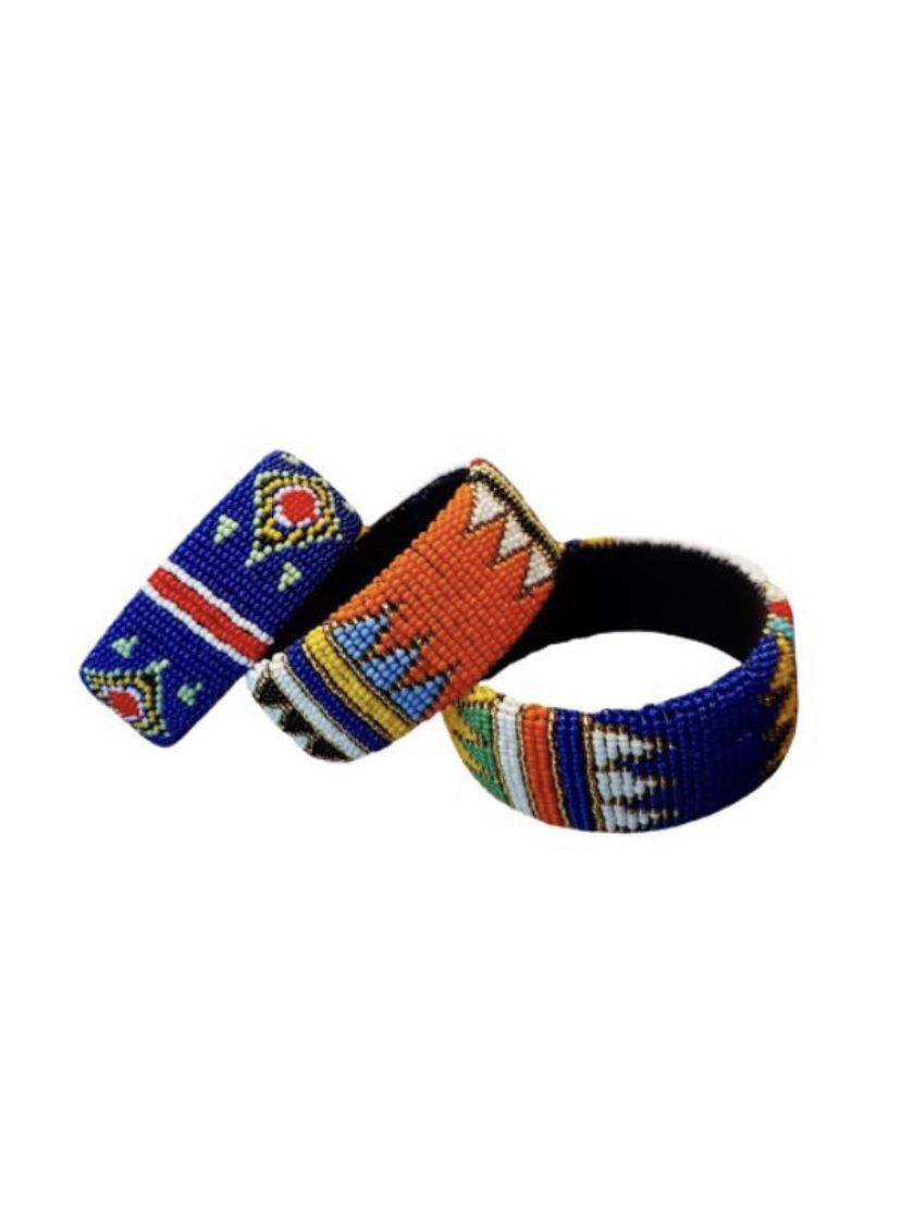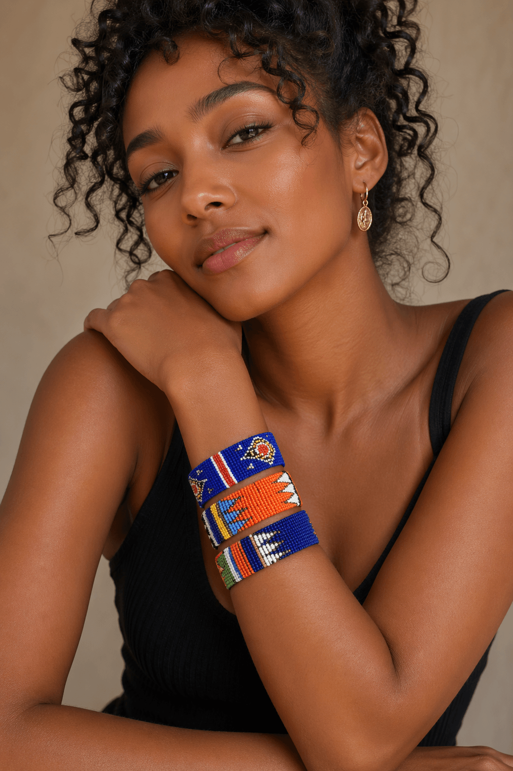 Elevate your accessory game with this vibrant set of three handcrafted beaded cuff bangles. Each piece is thoughtfully designed with intricate beadwork, showcasing bold patterns and rich, eye-catching colours that celebrate culture, artistry, and individuality.