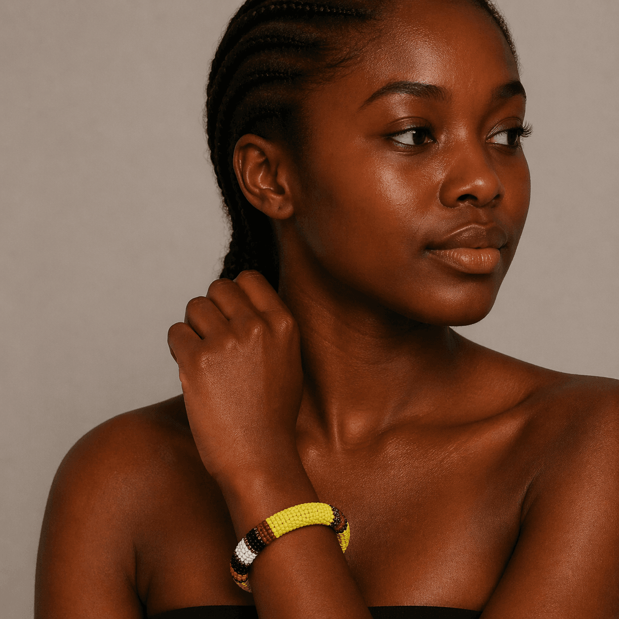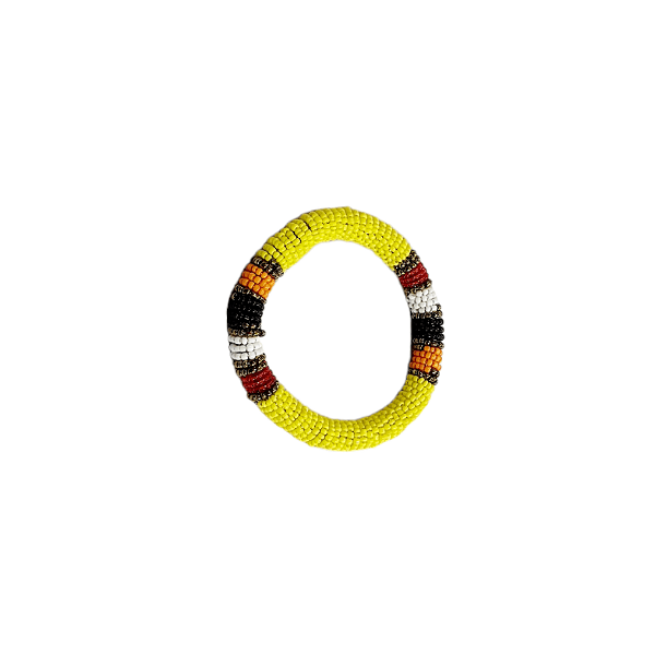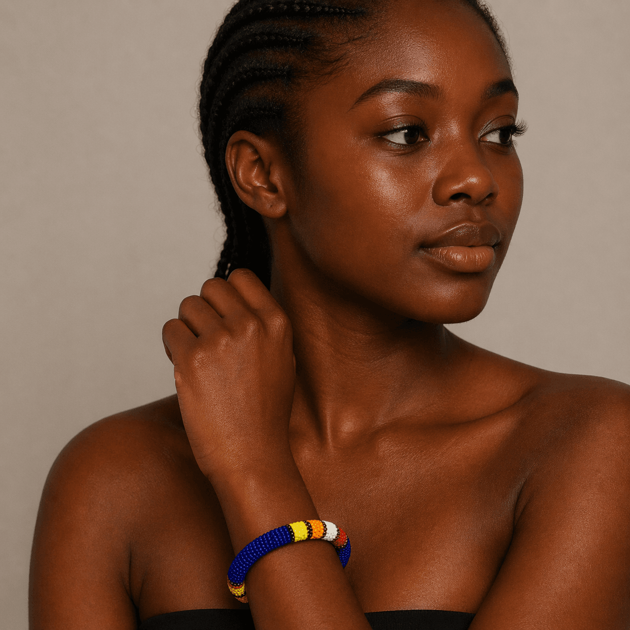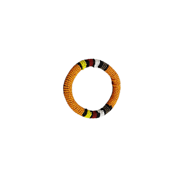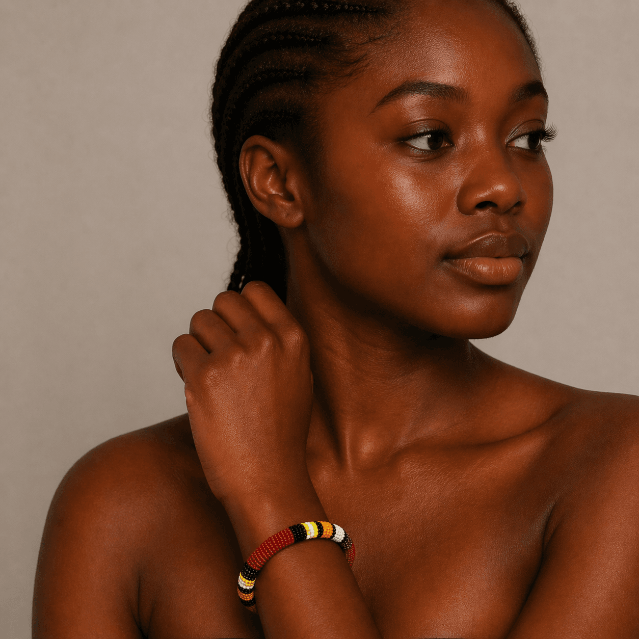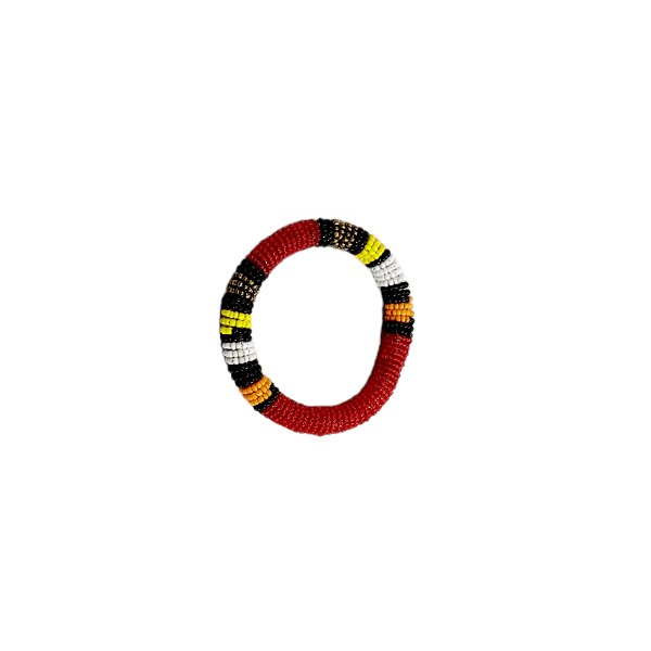 Bold, vibrant, and rooted in culture, this handcrafted beaded bangle is a statement of African artistry and identity. Designed with a rich red base and accented with intricate patterns of black, white, yellow, and gold tones, it embodies both tradition and modern style.
