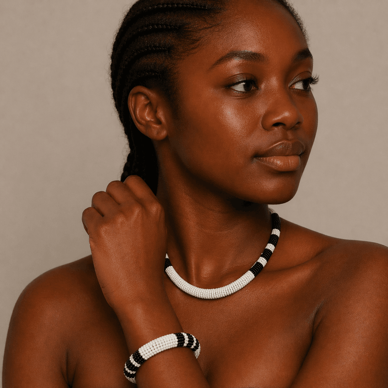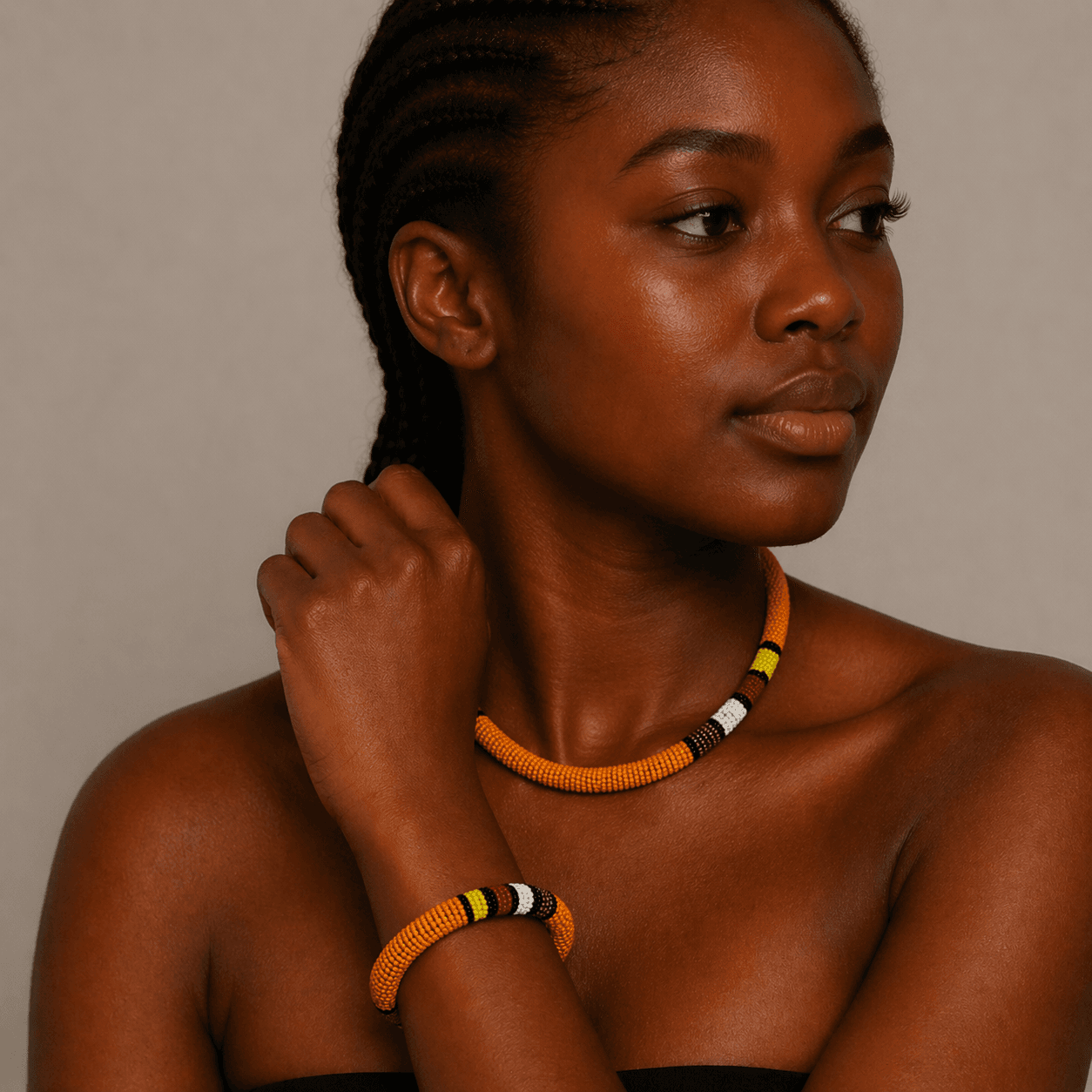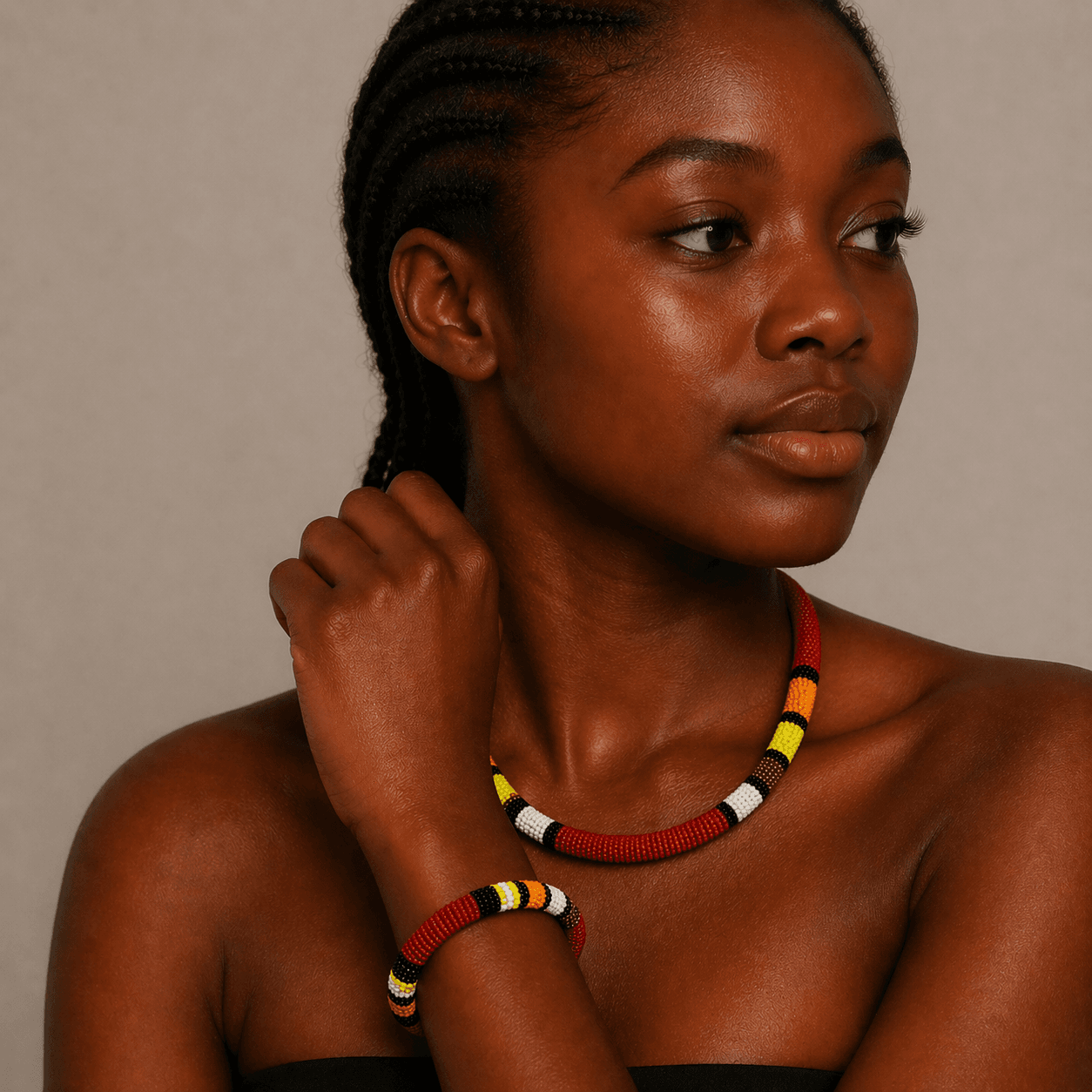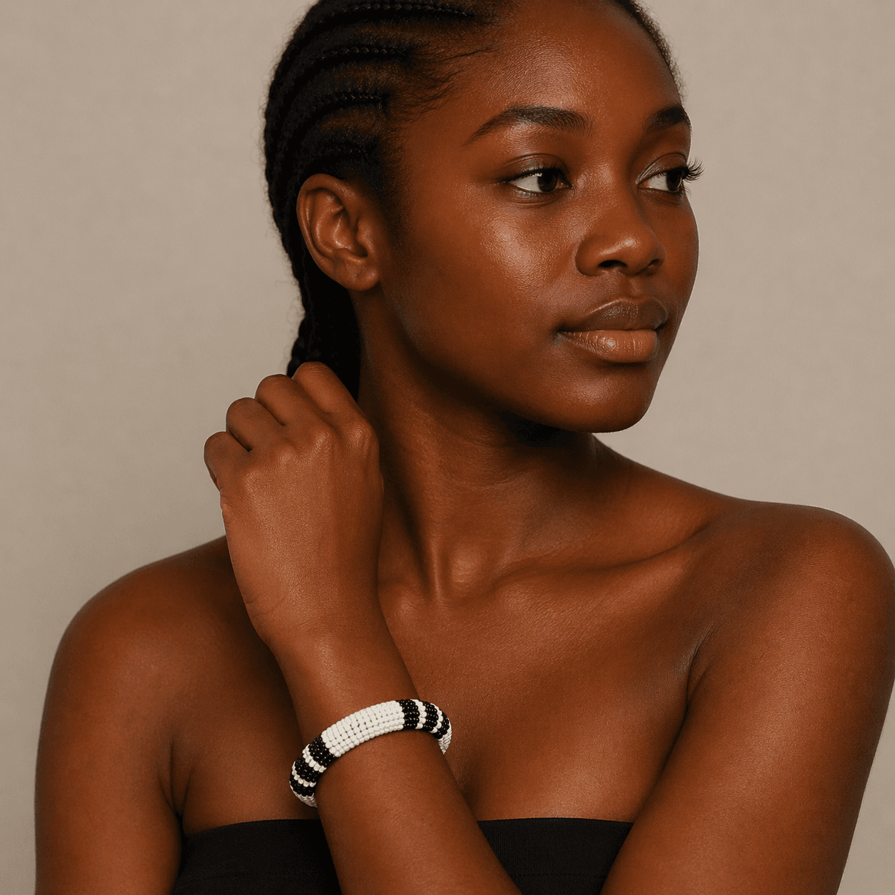 Bold, vibrant, and rooted in culture, this handcrafted beaded bangle is a statement of African artistry and identity. Designed with a rich red base and accented with intricate patterns of black, white, yellow, and gold tones, it embodies both tradition and modern style.