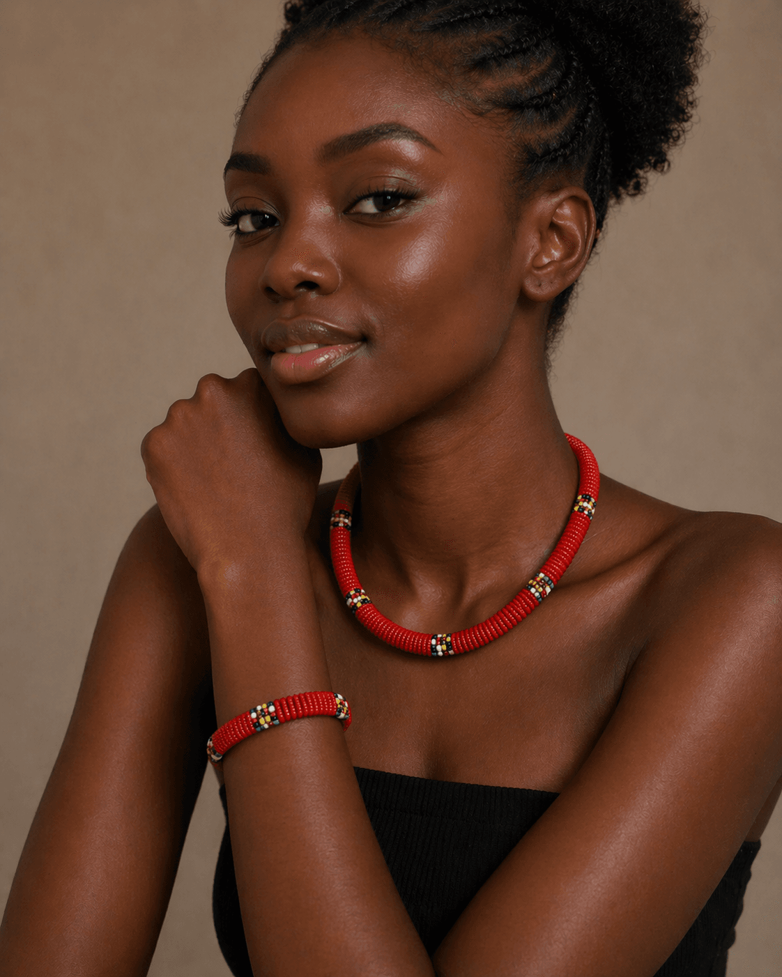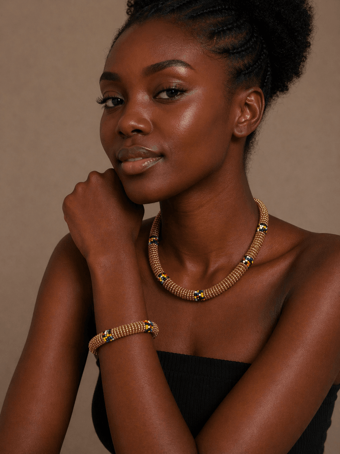 Designed to sit gracefully along the neckline, its structured, rounded form adds a refined yet powerful touch to any outfit. Whether paired with a simple top or styled for a special occasion, the Sahara Flame Necklace instantly elevates your look with rich colour and cultural elegance.